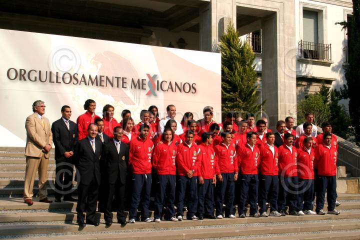 MEXICO, D.F., 09MAYO2006.- Vicente Fox Quesada, Presidente de la República saluda a Jesús "El Cabrito¨Arellano, jugador del Tricolor, durante el abanderamiento de la Selección Mexicana que participará en Mundial de Fútbol en Alemania, en la residencia oficial de los Pinos. FOTO: Moisés Pablo/CUARTOSCURO.COM