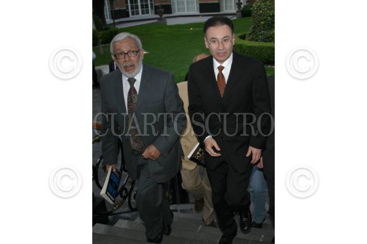 MEXICO, D.F. 09MAYO2006.- José María Pérez Gay conversa con Alfonso Durazo, previo a la presentación de su libro "Saldos del Cambio". FOTO: Nelly Salas/CUARTOSCURO.COM
