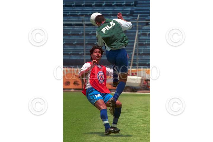 Sergio Almaguer y Julio César Pinheiro al término de la práctica de Cruz Azul en su estadio. FOTO: Pedro Mera/CUARTOSCURO.COM