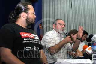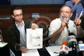 MÉXICO D.F. 10 MAYO2006.- Héctor Guerra, de Amnistía Internacional México y David Velasco, del Centro de Derechos Humanos Miguel Aguistín pro Juaréz, dieron a conocer en conferencia de prensa la entrega del informe ante la ONU, de la violación de los derechos humanos que se susitaron con los detenidos en San Salvador Atenco el jueves 4 de mayo. FOTO: Guillermo Perea / CUARTOSCURO.COM