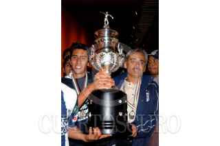 PACHUCA, HIDALGO 21MAYO2006.- El presidente del Club Pahuca, Jesús Martínez (derecha) sostiene la copa de campeón del torneo de clausura 2006. FOTO: Carlos Guzmán/CUARTOSCURO.COM