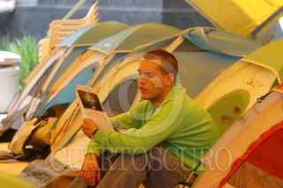 MÉXICO D.F. 22MAYO2006.- Jorge Emilio González, dirigente del Partido Verde Ecologista de México, lee la sintesis informativa, mientras se lleva a cabo el plantón a las afueras de la Secretaria de Salud, para demandar el cumplimiento de diversos temas de interés social al Gobierno Federal. FOTO: Diego Gallegos/CUARTOSCURO.COM