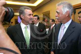 MÉXICO D.F. 22MAYO2006.- El candidato del PRI a la presidencia, Roberto Madrazo y Rolando Vega Saenz, presidente de la AMIS, al termino de la reunión de la Asociación Mexicana de Instituciones de Seguros, A.C. (AMIS), con el aspirante priísta a la presidencia, en el Club de Industriales. FOTO: Juan Flores/CUARTOSCURO.COM