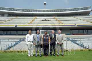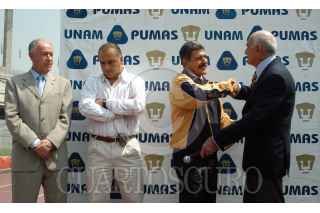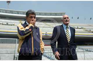 MEXICO D.F. 23MAYO2006.- En la cancha del estadio olimpico México 68, fue presentado Ricardo ¨Tuca ¨ Ferreti como el nuevo director tecnico de los Pumas de la UNAM, lo acompaña el presidente del patronato de Pumas, Víctor Mahbub. FOTO: Germán Romero/CUARTOSCURO.COM