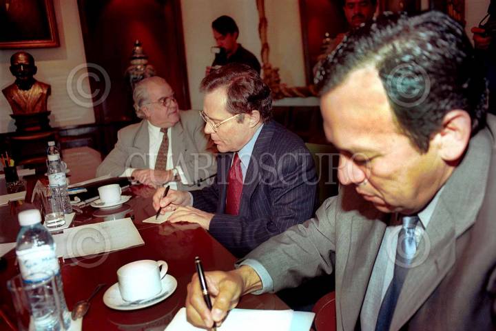 Jesús Zambrano (PRD) y Rodolfo Echeverría (PRI) conversan en la reunión con el títular de Gobernación, Santiago Creel. FOTO: Victoria Valtierra/CUARTOSCURO.COM