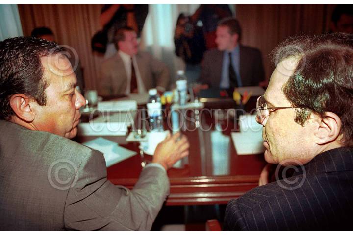 Jesús Zambrano (PRD) y Rodolfo Echeverría (PRI) conversan en la reunión con el títular de Gobernación, Santiago Creel. FOTO: Victoria Valtierra/CUARTOSCURO.COM