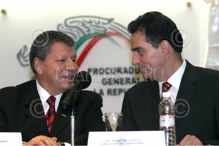 MEXICO, D.F. 07JUNIO2006.- Benjamín Fernadez Pichardo, presidente de la Asociación Mexicana de Editores conversa con Francisco Daniel Cabeza de Vaca, Procurador General de la República al termino de la ceremonia de firma de convenio con Editores Mexicanos. FOTO: Nelly Salas/CUARTOSCURO.COM