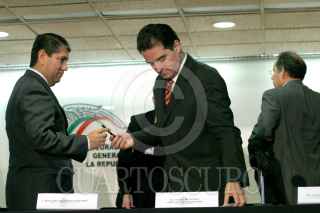 MEXICO, D.F. 07JUNIO2006.- Benjamín Fernadez Pichardo, presidente de la Asociación Mexicana de Editores conversa con Francisco Daniel Cabeza de Vaca, Procurador General de la República al termino de la ceremonia de firma de convenio con Editores Mexicanos. FOTO: Nelly Salas/CUARTOSCURO.COM