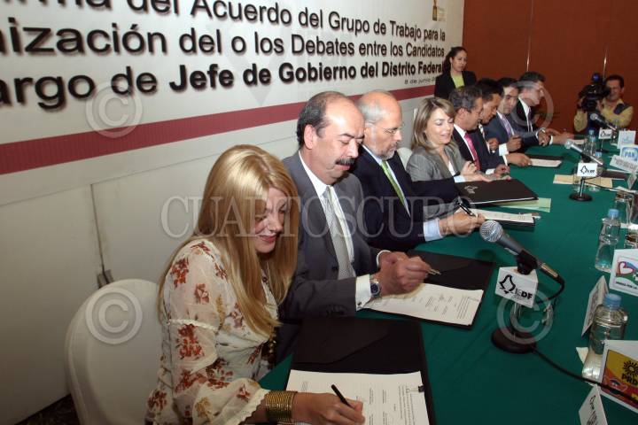 MEXICO, D.F., 08JUNIO2006.- Los representantes de los partidos que participaran en las elecciones a Jefe de Gobierno, firmaron un acuerdo para formalizar los debates entre los candidatos junto con los consejeros del IEDF en el Centro Asturiano. En la imagen los consejeros Nestor Vargas Solano, Yolanda Columba León, Carla A. Humphrey y Angel Díaz Ortíz. FOTO: Moisés Pablo/CUARTOSCURO.COM