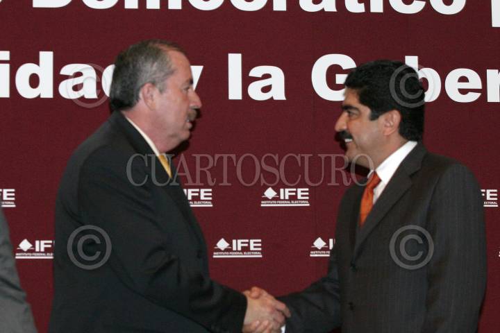 MEXICO, D.F., 13JUNIO2006.- Leonel Cota Montaño, presidente nacional del PRD, Manuel Espino, presidente del PAN y Mariano Palacio Alcocer, Presidente del PRI, firmaron el llamado Acuerdo Democrático por la Equidad, la Legalidad y la Gobernabilidad, en la sede del instituto electoral. FOTO: Moisés Pablo/CUARTOSCURO.COM
