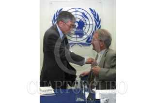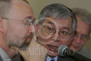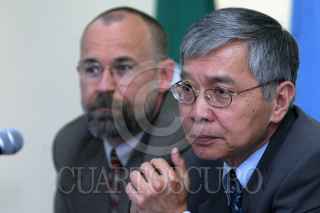 MEXICO, D.F. 15JUNIO2006.- Ray Kenndy, miembro del grupo de expertos de obsevadores electorales, Dong Nguyen, coordinador del proyecto de apoyo a la observación electoral 2006 y Paul Hoeffel, director del centro de Información de Naciones Unidas durante la conferencia de prensa que ofrecieron a los medios de comunicación. FOTO: Nelly Salas/CUARTOSCURO.COM