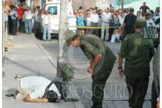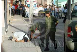ACAPULCO, GUERRERO 15JUNIO2006.- Un sicario fue asesinado, y su cuerpo fue dejato postrado sobre la banqueta, al morir, traia consigo cinco granadas que portaba en el interior de una mochila para equipo fotográfico, tambien se le encontró una pistola Prieto Bereta. FOTO: Eric Miralrío/CUARTOSCURO.COM