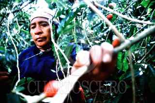 COATEPEC, VERACRUZ 13JUNIO2006.- Trabajadores de los cafetales en su mayoria indigenas cosechan el Cafe, arrancando la cereza y depositandolas en una canastilla que traen consigo. Trabajan de 6 de la mañana a 6 de la noche, son explotados por los dueños de los cafetales. FOTO: Carlos Tischler/CUARTOSCURO.COM