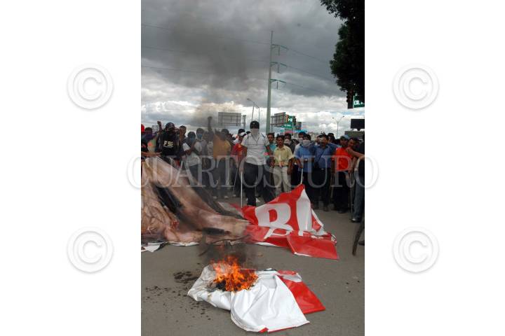 OAXACA, OAXACA, 23JUNIO2006.- Maestros del SNTE que permanencen en platón en el Zócalo desde hace varios días y cuya principal demanda es la destitución del gobernador Ulises Ruíz, acompañados por alumnos del nivel medio superior y simpatizantes bloqueron el cruce vehicular conocido como Cinco Señores. FOTO: Moisés Pablo/CUARTOSCURO.COM