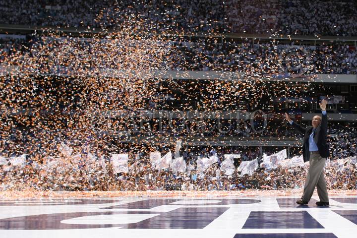 MÉXICO, D.F. 25JUNIO2006.- Felipe Calderón Hinojosa, candidato del Partido Acción Nacional (PAN) a la presidencia de la república, realizó su cierre de campaña en el Estadio Azteca. FOTO: Iván Stephens/CUARTOSCURO.COM
