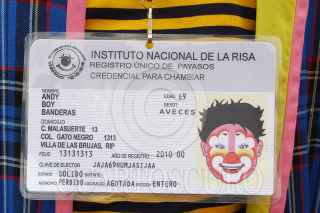 MEXICO D.F. 01JULIO2006.- El 2 de Julio se realizarán comicios federales, en donde estarán en disputa la Presidencia de la República para el periodo 2006-2012; 500 escaños en la Cámara de Diputados y 128 en el Senado de la República, las gubernaturas de los estados de Guanajuato, Jalisco y Morelos, así como la jefatura de Gobierno del Distrito Federal. El payaso Andy Boy muestra una credencial similar a la expide el IFE. FOTO: Germán Romero/CUARTOSCURO.COM