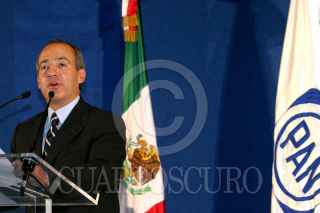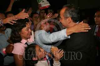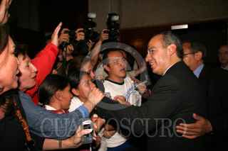 MEXICO, D.F., 06JULIO2006.- Felipe Calderon Hinojosa, candita del PAN a la presidencia de la República, fue declarado ganador de los comicios que se celebraron en pasado domingo, ofreció una confencia de prensa en su sede nacional minutos después de que el titular del IFE diera a conocer el resultado final. Al finalizar saludo a los simpatizantes que se dieron cita en la salon Gómez Morin. FOTO: Moisés Pablo/CUARTOSCURO.COM