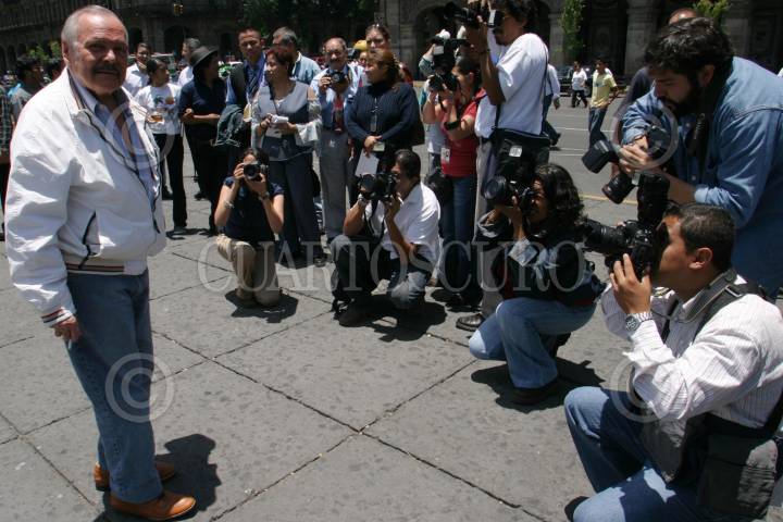 MEXICO, D.F., 19JULIO2006.- Isaac Mazri, Carmen Bazán, Jose Luis Cuevas y Gilberto Aceves, artistas plásticos, acudieron a presentar una denuncia en la agencia 50, por la destrucción de sus carteles que estaban en exhibición en avenida Juárez. FOTO: Moisés Pablo/CUARTOSCURO.COM