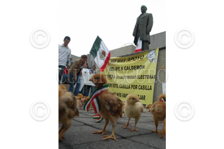 MÉXICO D.F. 27 JULIO 2006.- Decenas de simpatizantes del candidato presidencial del PRD se manifestaron en el patio central del IFE. Los manifestantes llevaron cientos de pollos como protesta ante el desempeño de la autoridad electoral. FOTO: Germán Romero/CUARTOSCURO.COM