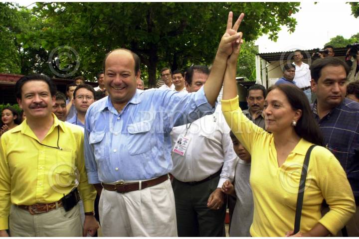 Raúl Ojeda, candidato a gobernador por el PRD levanta la mano en señal de victoria junto con Amalia García, líder nacional del partido del sol azteca. FOTO: Pedro Mera/CUARTOSCURO.COM
