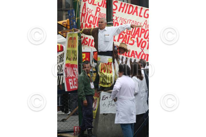 MÉXICO, D.F. 4AGOSTO2006.- En la plancha del Zócalo capitalino y calles aledañas se han instalado campamentos de simpatizantes del PRD. De espaldas a la plancha del Zócalo, un anciano se crucifica como un gesto de apoyo a Andrés Manuel López Obrador. FOTO: Paola HidalgoCUARTOSCURO.COM
