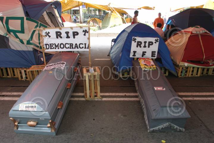 MEXICO, D.F., 07AGOSTO2006.- Cada vez luce mas atiborrrado de casa de campaña, lonas y cuerdas para sostenerlas, en el Paseo de la Reforma, cuando se cumplen más de una semana de plantón por parte de los simpatizantes de la coalición Por el Bien de Todos. En la imagen unos feretros alusivos al supuesto fraude electoral por parte del IFE. FOTO: Moisés Pablo/CUARTOSCURO.COM