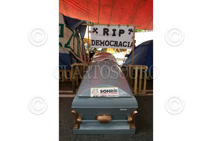MEXICO, D.F., 07AGOSTO2006.- Cada vez luce mas atiborrrado de casa de campaña, lonas y cuerdas para sostenerlas, en el Paseo de la Reforma, cuando se cumplen más de una semana de plantón por parte de los simpatizantes de la coalición Por el Bien de Todos. En la imagen unos feretros alusivos al supuesto fraude electoral por parte del IFE. FOTO: Moisés Pablo/CUARTOSCURO.COM