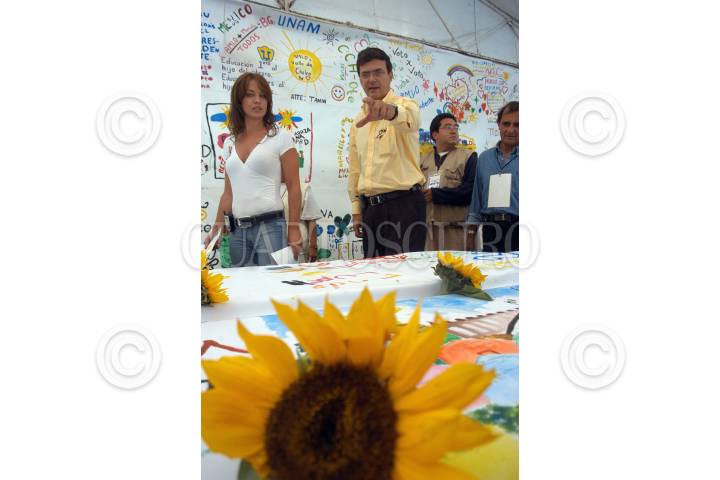 MÉXICO D.F. 12AGOSTO2006.- El candidato electo a jefe de gobierno del D.F. Marcelo Ebrat acompañado de su esposa, Mariagna Prats, asistieron a la presentación de un mural en apoyo al conteo voto por voto, realizado por niños que se encuentran en los campamentos de avenida Reforma. FOTO: Guillermo Perea/ CUARTOSCURO.COM