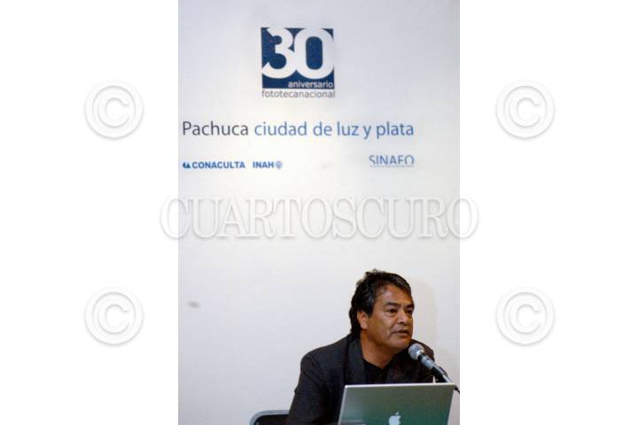 PACHUCA, HIDALGO 23AGOSTO2006.- El director de la agencia y revista Cuartoscuro, Pedro Valtierra, durante la conferencia en la Fototeca Nacional de Pachuca, a la cual fue invitado, dentro de las actividades del 30 aniversario de esta institución. FOTO: Guillermo Perea/CUARTOSCURO.COM
