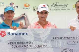 ACAPULCO, GUERRERO, 17SEPTIEMBRE2006.- La golfista mexicana Lorena Ochoa sucumbió ante la sueca Annika Sorenstam, por marcador de 11-7 en el Acapulco Skins en el campo Tres Vidas. De la bolsa de 270 mil dólares en disputa, 165 mil fueron para Annika; mientras que Lorena se tuvo que conformar con la cantidad de 105 mil. FOTO: TELEVISA/CUARTOSCURO.COM