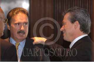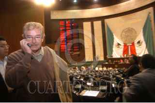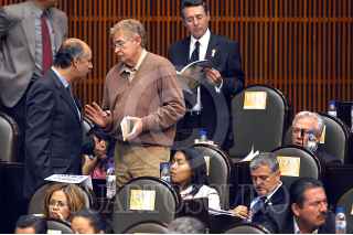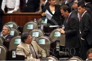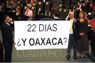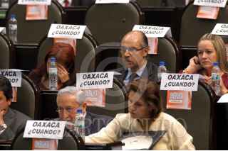 MÉXICO D.F. 19SEPTIMEBRE2006.- Los diputados, Alejandro Chanona Burguete, coordinador de los diputados de Convergencia y María del Carmen Salvatori Bronca, muestran en sus curules letreros con la leyenda " Oaxaca ¿Cuando?" durante la Sesión en la Cámara de Diputados. FOTO: GUILLERMO PEREA/CUARTOSCURO.COM