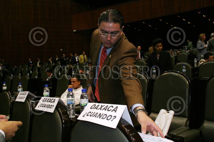 MEXICO, D.F. 21SEPTIEMBRE2006.- Diputados del partdio Convergencia para la Democracia colocaron unos letreros en sus curules que dicen: Oaxaca ¿Cuándo?. FOTO. NELLY SALAS/CUARTOSCURO.COM