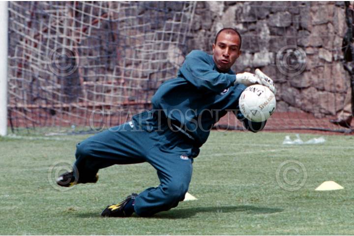 El defensa central peruano Juan Reynoso, disputa el balon con un compañero durante el entrenamiento previo a su proximo encuentro del Campeonato Invierno 2001. FOTO: Oswaldo Ramírez/CUARTOSCURO.COM