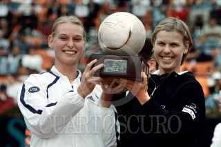 Barbara Schett, de Australia, y Anke Huber, de Alemania, se impusieron a las favoritas Mary Pierce y Sandrine Testud en la final de dobles femenil del Abierto Mexicano de Tenis.