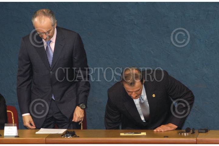 MÉXICO, D.F. 18OCTUBRE2006.- Francisco Gil Díaz, Secretario de hacienda y Crédito Público, y Vicente Fox Quesada, primer mandatario mexicano, durante el evento "Acciones y perspectivas del ambiente de negocios en México" realizado en el salón Adolfo López Mateos de la residencia oficial de Los Pinos. FOTO:IVÁN STEPHENS/CUARTOSCURO.COMCUARTOSCURO.COM