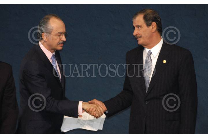 MÉXICO, D.F. 18OCTUBRE2006.- Francisco Gil Díaz, Secretario de hacienda y Crédito Público, y Vicente Fox Quesada, primer mandatario mexicano, durante el evento "Acciones y perspectivas del ambiente de negocios en México" realizado en el salón Adolfo López Mateos de la residencia oficial de Los Pinos. FOTO:IVÁN STEPHENS/CUARTOSCURO.COMCUARTOSCURO.COM