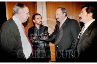 Emilio Gómez de la Secretaría del Trabajo, Francisco Hernández Juárez de la UNT, Jaime Luis González de ASPA y Tomás del Toro del SIA conversan antes del inicio de las negociaciones en esta dependencia. FOTO: Victoria Valtierra/CUARTOSCURO.COM