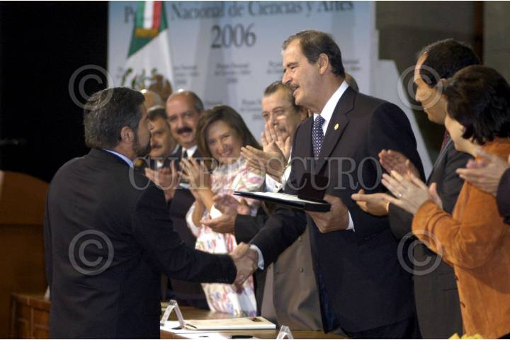 MÉXICO D.F. 08NOVIEMBRE2006.- el presidente Vicente Fox Quezada, acompañado de la secretaria de cultura Sari Bermúdez y Lazaro Cardenas Batel gobernador de Michoacan, durante la entrega del Premio Nacional de Ciencias y Artes, donde la actriz Julieta Egurrola le entrego una carta que contiene supuestas pruebas de violación de derechos humanos en Oaxaca. FOTO: FERNANDO GARCIA /CUARTOSCURO.COM