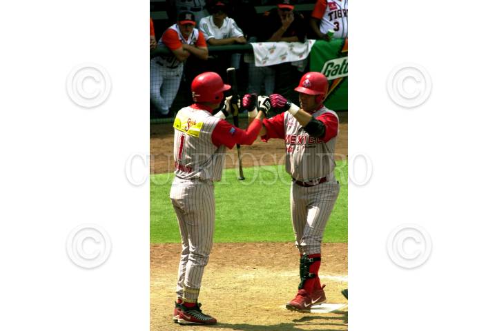 José Luis Sandoval parador en corto de los Diablos Rojos de México es felicitado por Ramón Esquer momentos después de conectar el segundo home rune y la sexta carrera. En el segundo juego de la serie los Tigres Capitalinos vencierón a los Diablos Rojos 11-6 carreras. FOTO: David Bolaños/CUARTOSCURO.COM