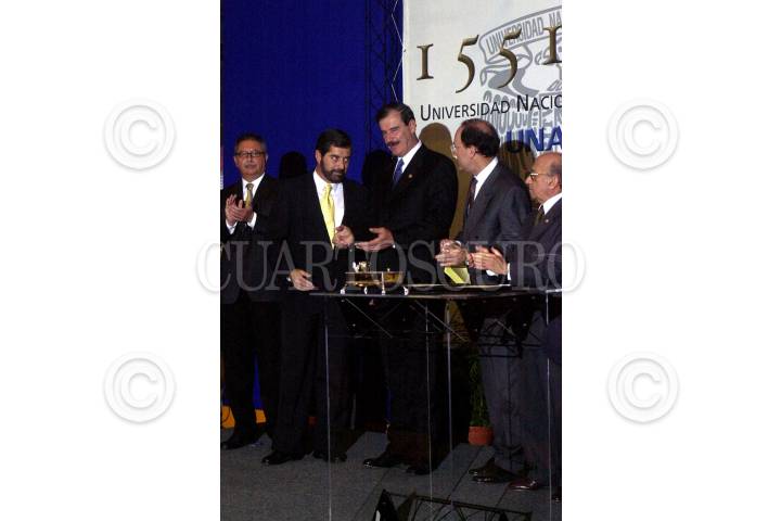 El rector Juan Ramón de la Fuente y el Presidente Vicente Fox se dan la mano al término de la ceremonia en la que se festejó el 450 aniversario de la Univerisidad Nacional Autónoma de México en el Palacio de Mineria. Al término el presidente y el rector dierón un recorrido por las instalaciones del palacio donde se da una muestra de lo que es la UNAM. FOTO: David Bolaños/CUARTOSCURO.COM