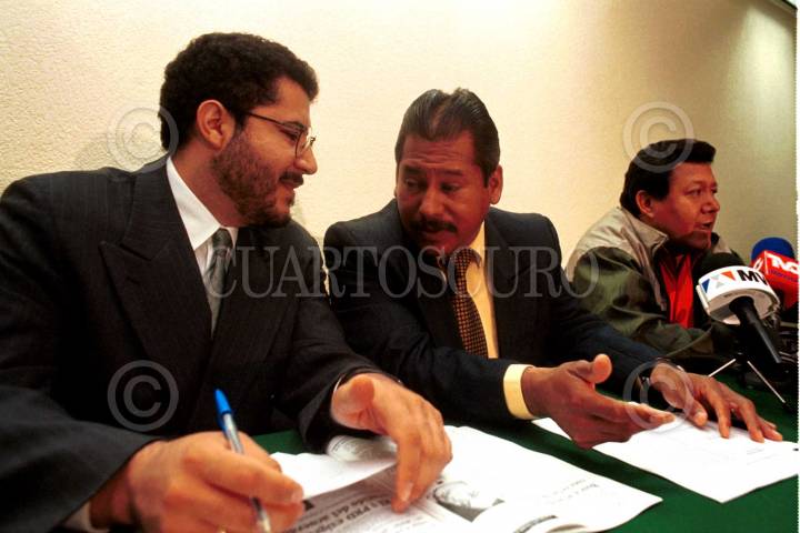 Martí Batres, Arturo Herviz y el líder sindical del ingenio "San Cristobal", Clemente Pacheco Mora; hablaron sobre la expropiación de ingenios azucareros por parte del Gobierno Federal. FOTO: Christian Palma/CUARTOSCURO.COM