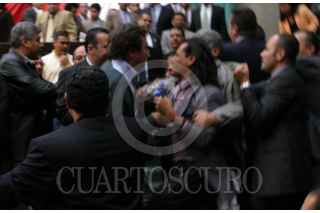 MÉXICO, D.F., 28NOVIEMBRE2006.- Diputados del PAN del PRD se volvieron a enfrascar a empujones y patadas, por su lucha de la tribuna del Congreso, luego de que ambos bandos la han tomado, los panistas con tal de asegurar la toma de protesta de Felipe Calderón y los perredistas con impedirla. FOTO: MOISÉS PABLO/CUARTOSCURO.COM
