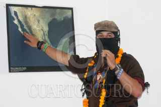 CHIMALACO, SAN LUIS POTOSI. 28 NOVIEMBRE 2006. El Subcomandante Marcos, Delegado Zero de La Otra Camapña del EZLN, explica con un mapa el recorrido que hizo por 32 estados de la República Mexicana este año, durante una visita a la Escuela Autónoma de Apicultura en este municipio. El día de hoy Marcos concluye La Otra Campaña. FOTO: MOYSÉS ZÚÑIGA/CUARTOSCURO.COM