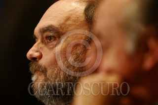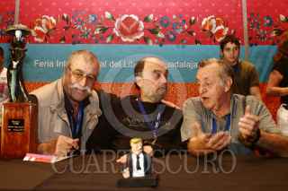 GUADALAJARA JALISCO 02DICIEMBRE2006.- El caricaturista Roberto Fontanarrosa quien primero deleito a un publico habido de sus ocurrencias para después recibir de manos de el Rector de la Universidad de Guadalajara "La Catrina" reconocimiento que otorga año con año la Fil a los móneros. FOTO: JOSÉ MARÍA MARTÍNEZ/CUARTSOCURO.COM