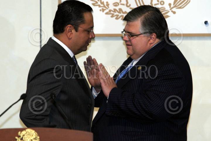 MEXICO, D.F. 03DICIEMBRE2006.- Germán Martínez, secretario de la Función Pública conversa con Agustín Carstens, secretario de Hacienda y Crédito Pública previo al anuncio de decreto de austeridad en la residencia oficial de los Pinos. FOTO: NELLY SALAS/CUARTOSCURO.COM