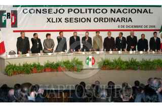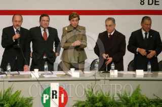 MÉXICO, D.F., 08DICIEMBRE2006.- Los integrantes de la mesa directiva Emilio Gamboa, diputado, Carlos Chauran, Mariano Palacios Alcocer, presidente del partido, Rosario Green, senadora, Joaquín Gamboa Pascoe, líder de la CTM y Melquíades Morales, durante los trrabajos de la XLIX Sesión Ordinaria del Consejo Político Nacional del PRI en el Teatro Ferrocarrilero. FOTO: MOISÉS PABLO/CUARTOSCURO.COM