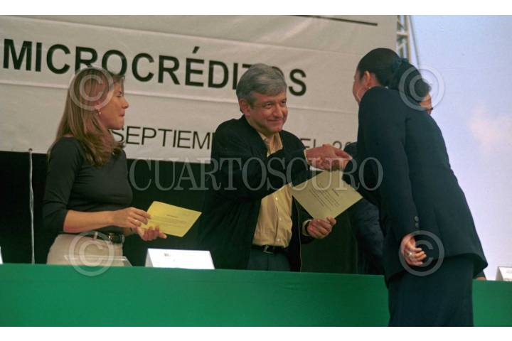 Andrés Manuel López Obrador jefe de gobierno capitalino y Alejandro Encinas director del fondo de Desarrollo Económico , recorren una muestra de trabajos realizados por personas beneficiadas con los microcréditos otorgados por el gobierno capitalino. FOTO: David Bolaños/CUARTOSCURO.COM