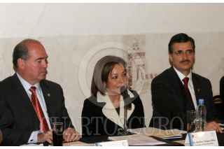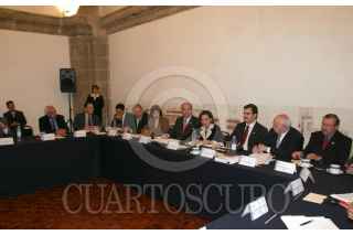 MÉXICO, D.F., 11DICIEMBRE2006.- Arnaldo Ochoa, Josefina Vazquez Mota, Secretaría de Educación Pública y Tonatiuh Bravo, presidente de la comisión de educación de la Cámara de Diputados, durante una reunión con rectores de varias universidades del pais en la sede de la SEP. FOTO: MOISÉS PABLO/CUARTOSCURO.COM