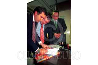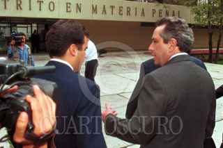 Carlos Cabal Peniche y su abogado observan las fojas en donde firman de enterados sobre su declaración en los juzgados del Reclusorio Oriente. FOTO: Pedro Mera/CUARTOSCURO.COM