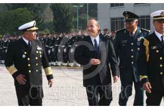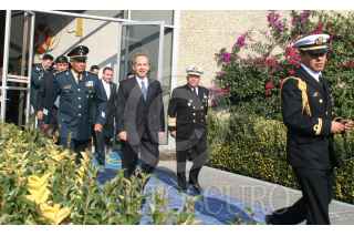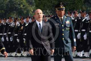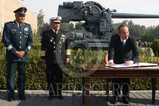 MÉXICO, D.F. 19DICIEMBRE2006.- El presidente Felipe Calderón Hinojosa desayunó este martes con personal naval encabezado por el secretario de Marina-Armada de México, Mariano Francisco Saynez, con motivo del fin de año. En la imagen con Guillermo Galván, secretario de la defensa nacional durante la firma del libro oficial. FOTO: PAOLA HIDALGO/CUARTOSCURO.COM